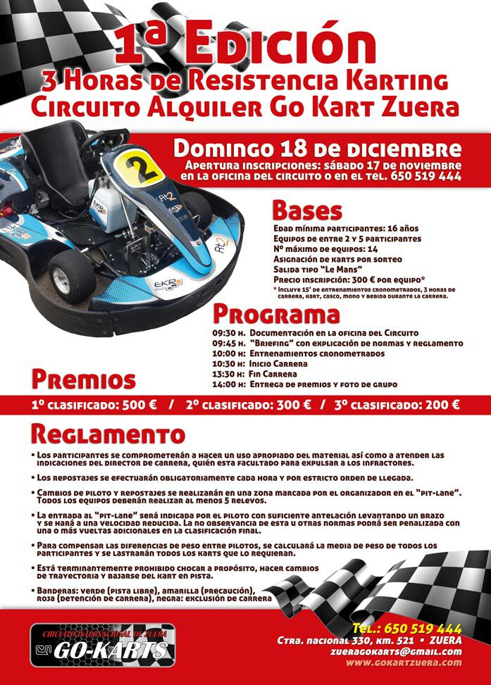 La resistencia de Diciembre será dura, como ya sabemos en Zuera suele hacer bastante fresquito, así que será divertido ver como los equipos logran controlar el frío en sus pilotos. Salida tipo Lemans, de 2 a 5 pilotos, control de pesos por equipo y 5 paradas (stins de 30 minutos por piloto) son algunos de los titulares de esta resistencia. Por último, algo que aunque muy muy interesante, no debería volver locos a los pilotos, 3 estupendos premios, que podemos ver en el Cartel oficial del circuito. ¡Sólo para el primero 500€!